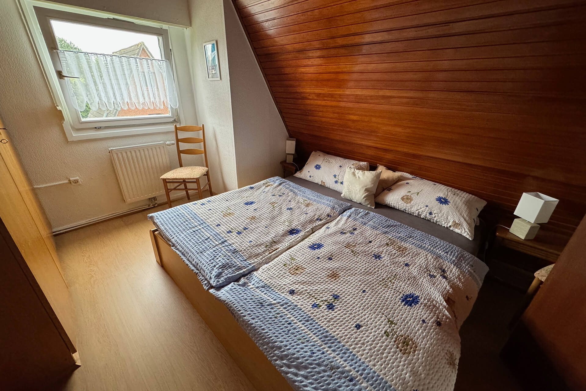 Dort befinden sich zwei Schlafräume, der größere mit Doppelbett, der kleinere mit zwei Einzelbetten. Kinderbett und Kinderhochstuhl können auf Wunsch zur Verfügung gestellt werden. Bettwäsche und Handtücher können gegen Entgelt bereitgestellt werden.