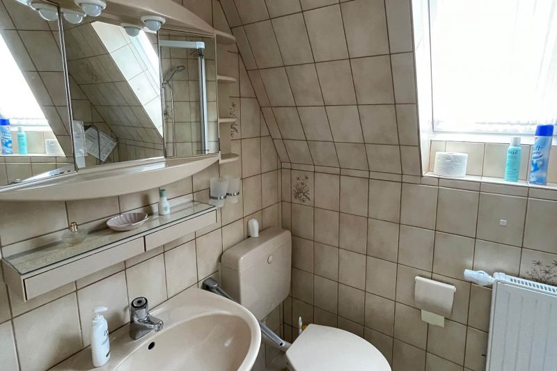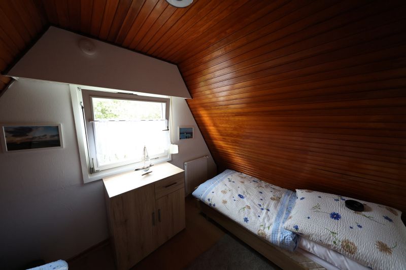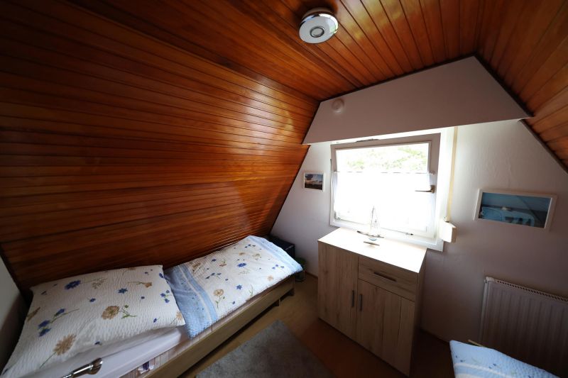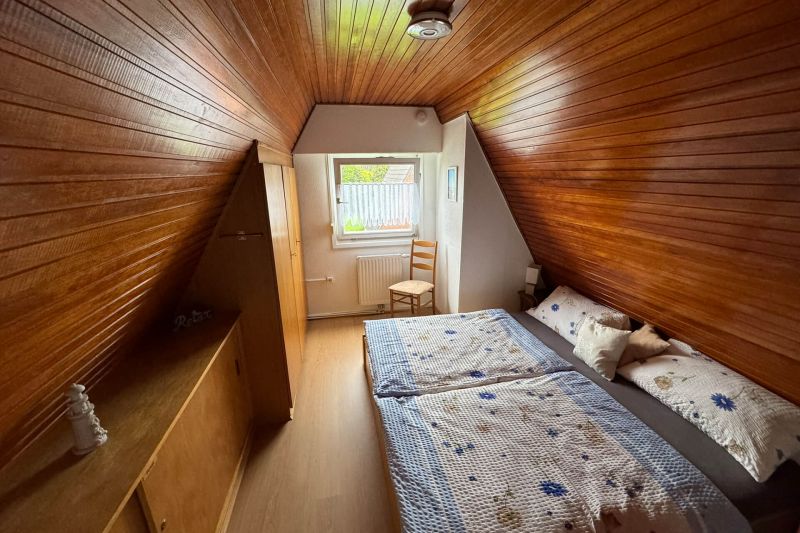Dort befinden sich zwei Schlafräume, der größere mit Doppelbett, der kleinere mit zwei Einzelbetten. Kinderbett und Kinderhochstuhl können auf Wunsch zur Verfügung gestellt werden. Bettwäsche und Handtücher können gegen Entgelt bereitgestellt werden.