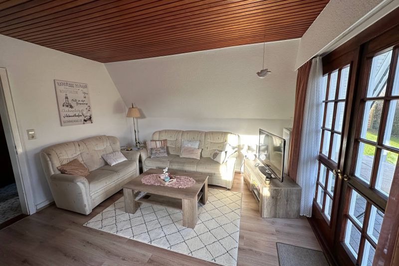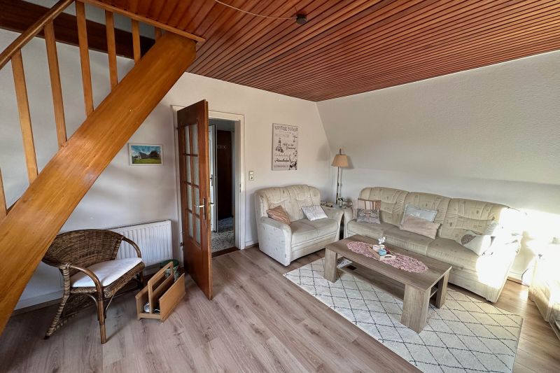 Im gemütlichen Wohnzimmer mit separatem Essplatz finden Sie SAT-TV und eine Mini-Hifi-Anlage vor. Die Terrasse ist durch das Wohnzimmer oder vom Garten aus zu betreten. Vom Wohnzimmer aus führt eine Treppe ins Dachgeschoss.