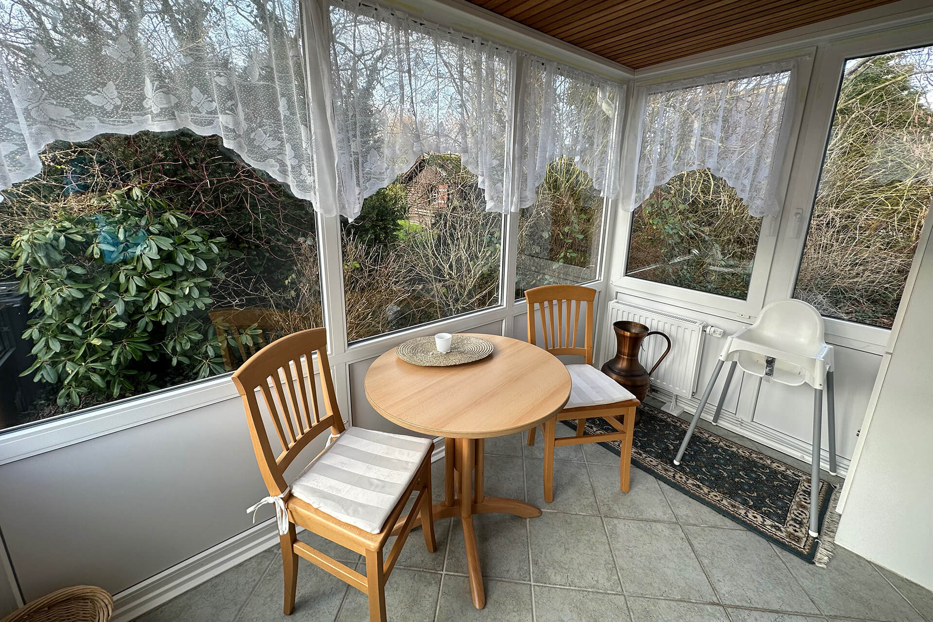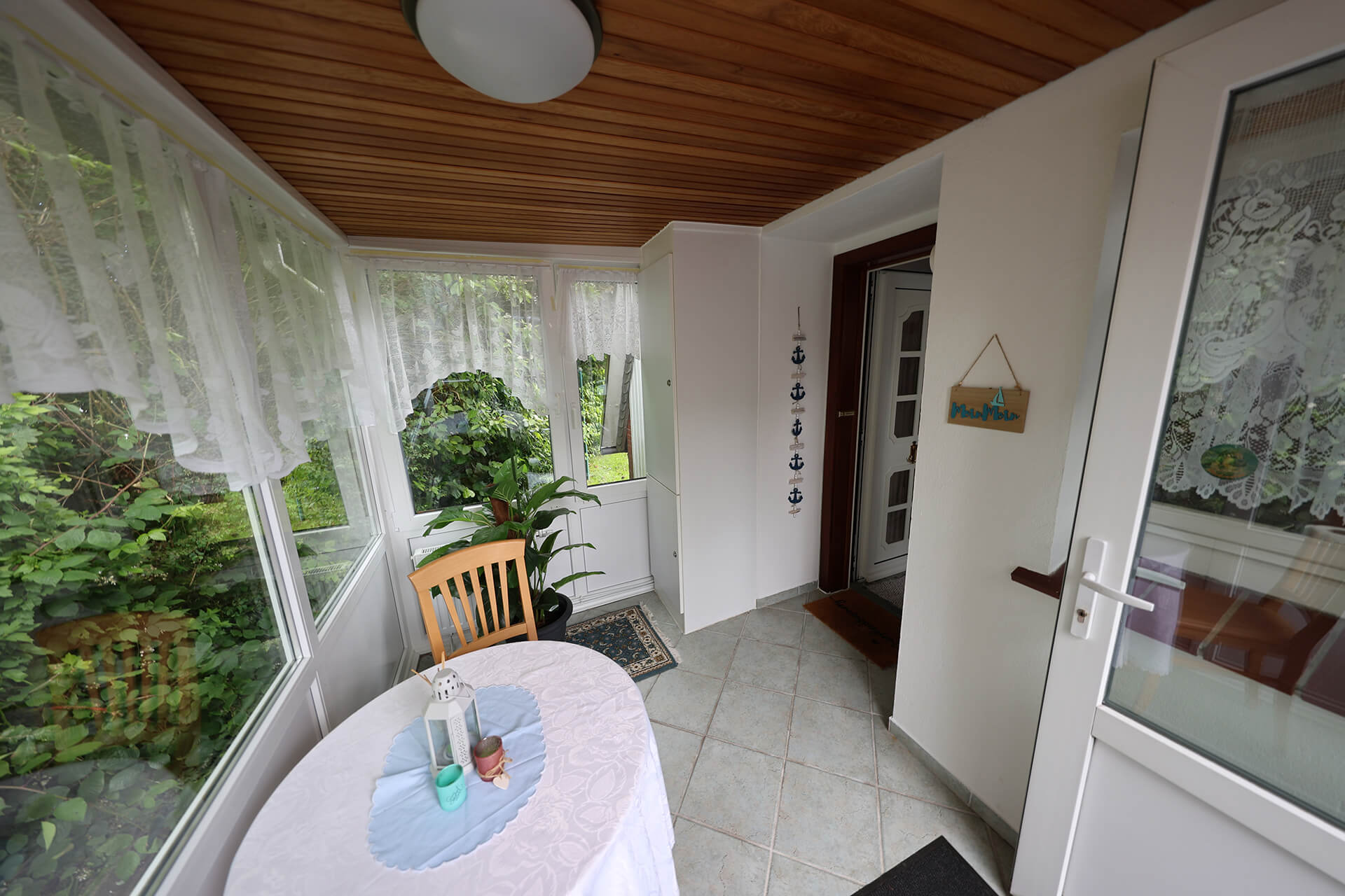 Im Eingangsbereich des Erdgeschosses befindet sich der Wintergarten, ausgestattet mit Tisch und Stühlen. Links geht es von der Diele ins Bad (mit Dusche, WC und Waschmaschine), rechts geht es in die Küche. Diese ist ausgestattet mit Spülmaschine, Mikrowelle, Nespresso Maschine, Kaffeemaschine, Toaster, Wasser- und Eierkocher und allem, was zum täglichen Gebrauch benötigt wird.
